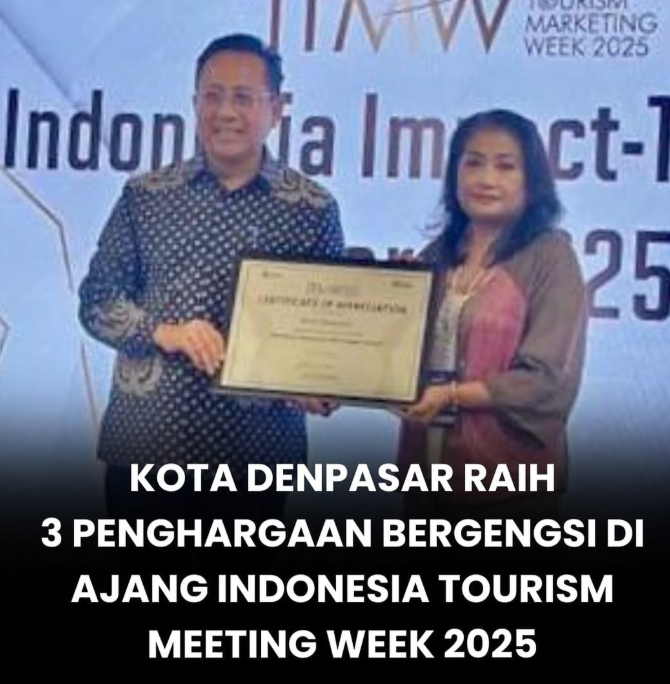 Pemerintah Kota Denpasar kembali menorehkan prestasi membanggakan di tingkat nasional melalui ajang Indonesia Tourism Meeting Week (ITMW) 2025 yang diselenggarakan di Hotel Maya Sanur pada Sabtu (11/10). Pada gelaran bergengsi tersebut, Denpasar sukses meraih tiga penghargaan sekaligus, yakni Indonesia Prosperity City, Indonesia Green City, dan Indonesia Peace and Cultural Harmony City. Penghargaan diserahkan oleh Senator DPD RI, Irman Gusman, dan diterima langsung oleh Sekretaris Dinas Pariwisata Kota Denpasar, Ida Ayu Dewi Citrawati. Keberhasilan ini menjadi bukti konkret komitmen Denpasar dalam membangun pariwisata yang tidak hanya maju secara ekonomi, tetapi juga memperhatikan aspek keberlanjutan lingkungan, keharmonisan sosial, dan pelestarian budaya lokal.