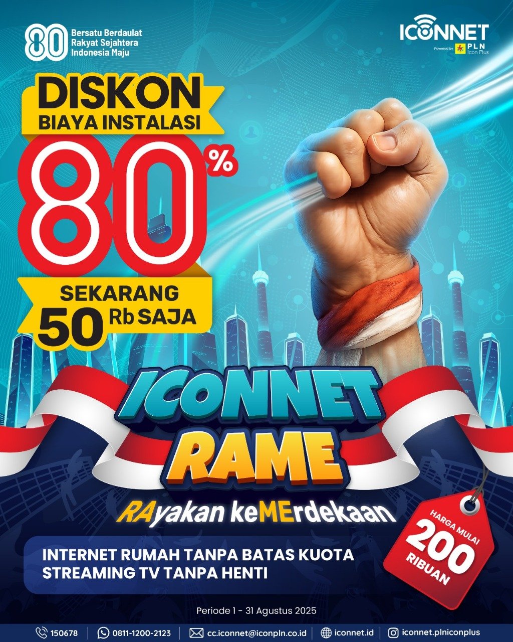 Dalam rangka menyambut Hari Ulang Tahun ke-80 Republik Indonesia, ICONNET menghadirkan promo spesial yang sayang untuk dilewatkan. Pelanggan baru bisa menikmati diskon biaya instalasi hingga 80%. Dari harga normal Rp250.000, kini cukup bayar Rp50.000 saja!