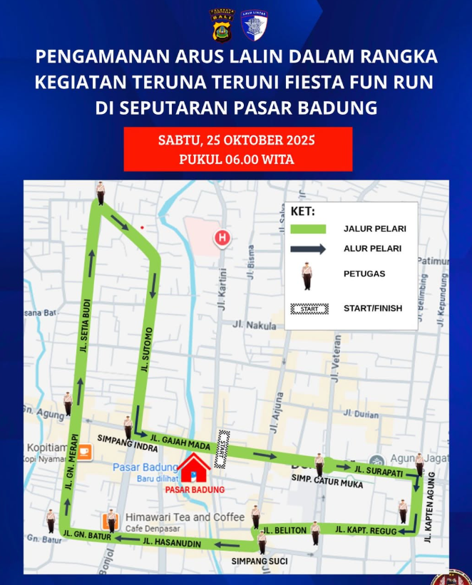 Selain itu, petugas gabungan dari Dinas Perhubungan, Polresta Denpasar, dan panitia penyelenggara akan disiagakan di beberapa titik strategis untuk membantu mengatur lalu lintas dan memastikan keamanan seluruh peserta maupun pengguna jalan.