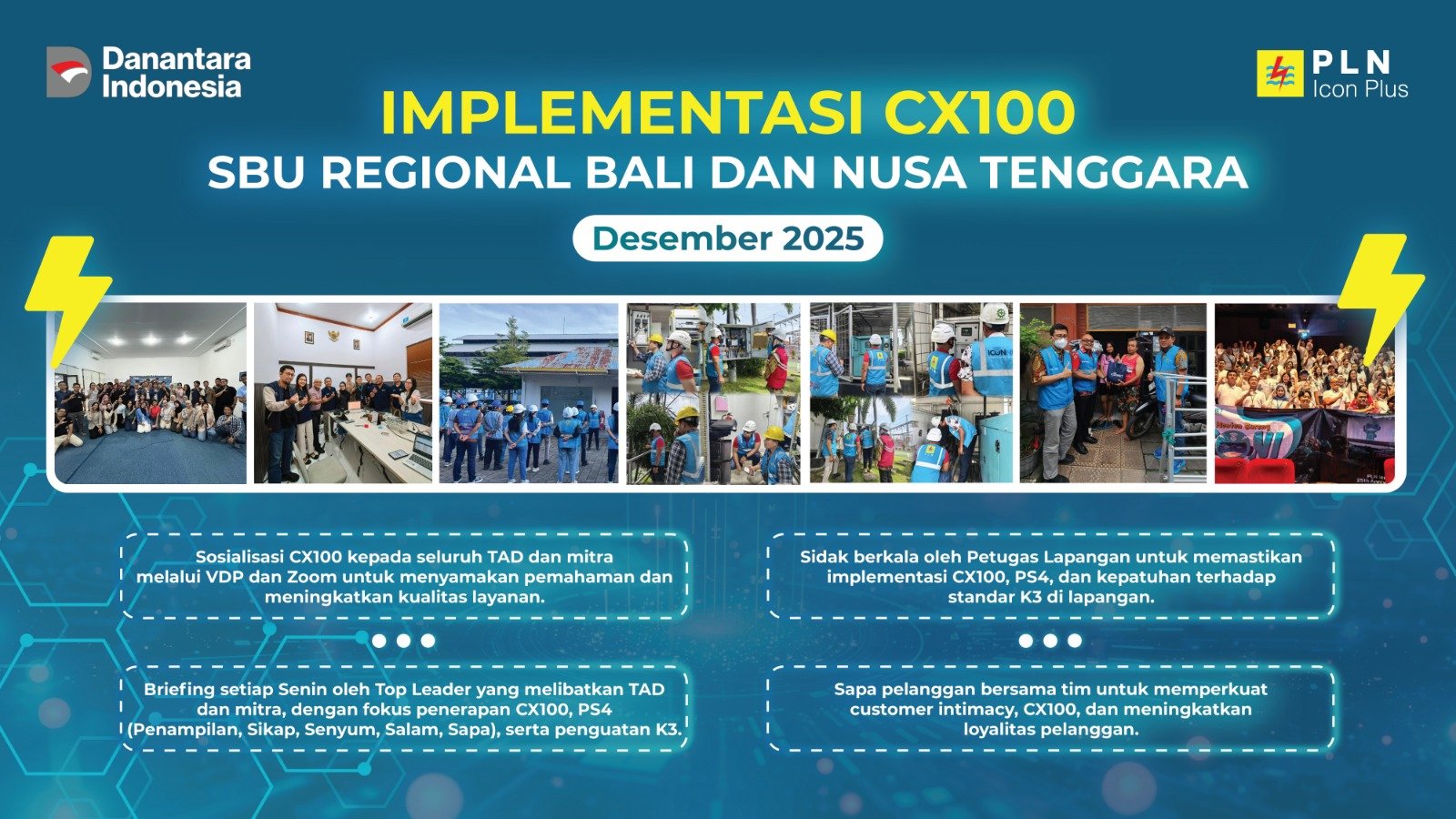 PLN Icon Plus SBU Regional Bali dan Nusa Tenggara terus memperkuat komitmen dalam menghadirkan layanan prima melalui implementasi CX100 yang dilaksanakan secara berkelanjutan sepanjang Desember 2025. Program ini menjadi langkah strategis dalam menyatukan pemahaman, sikap, dan budaya pelayanan seluruh insan PLN Icon Plus guna menciptakan pengalaman pelanggan yang unggul dan konsisten.
