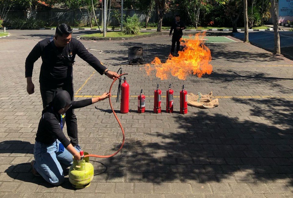 Kegiatan tersebut melibatkan tim profesional dari Pemadam Kebakaran Kota Denpasar yang memberikan pelatihan langsung tentang penggunaan alat pemadam api ringan (APAR), teknik evakuasi, serta langkah-langkah pencegahan kebakaran di lingkungan kerja. Seluruh karyawan aktif mengikuti simulasi dengan antusias, mencoba secara langsung alat pemadam api dan memahami prosedur evakuasi yang tepat.