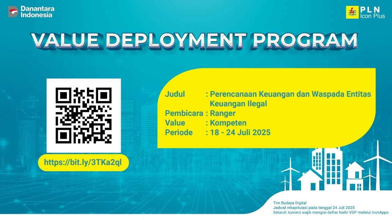 Denpasar, 18 Juli 2025 – PLN Icon Plus SBU Regional Bali & Nusa Tenggara kembali menggelar Value Deployment Program (VDP) dengan tema “Perencanaan Keuangan dan Waspada Entitas Keuangan Ilegal”. Kegiatan yang berlangsung pada Jumat, 18 Juli 2025 ini menghadirkan narasumber Kamal Syarif, yang memberikan pemahaman mendalam mengenai pentingnya pengelolaan keuangan yang sehat sekaligus meningkatkan kewaspadaan terhadap maraknya entitas keuangan ilegal.