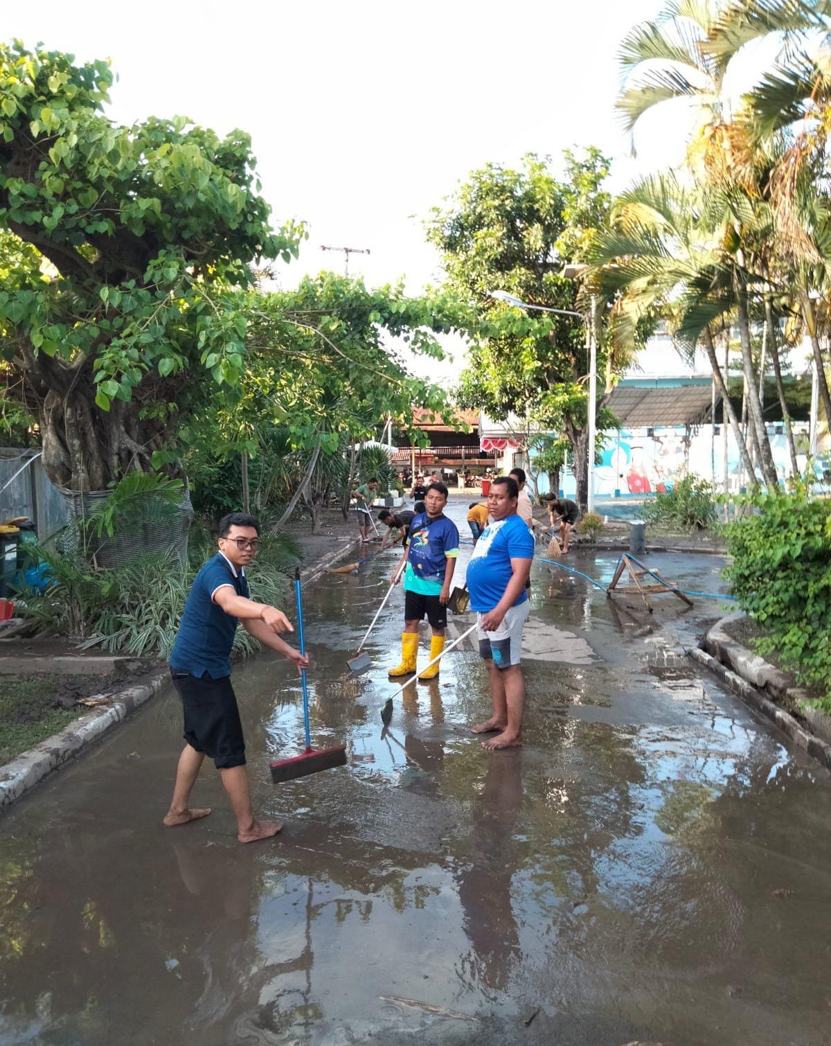 Selain membersihkan lumpur dan sampah yang terbawa banjir, kegiatan ini juga difokuskan pada perbaikan ringan serta penataan kembali fasilitas agar lingkungan kerja kembali bersih, nyaman, dan layak digunakan. Semangat kebersamaan dan kerja sama antar karyawan menjadi hal utama dalam menyelesaikan proses pemulihan kantor pasca banjir.